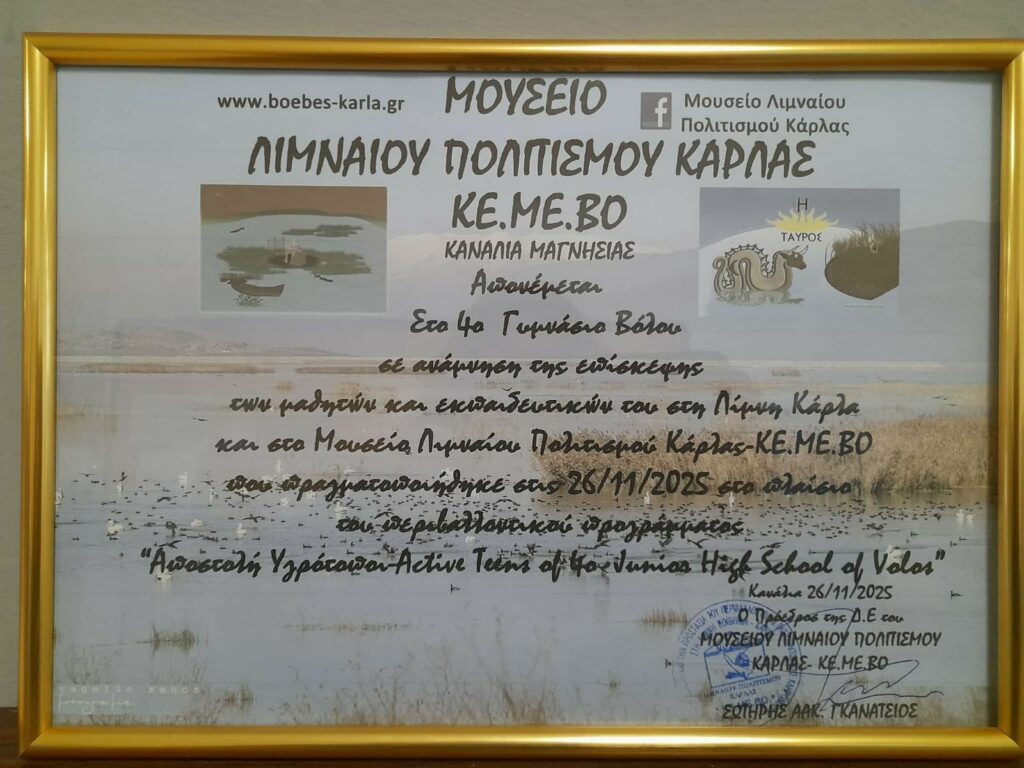 Μια πολύ ενδιαφέρουσα εκπαιδευτική επίσκεψη πραγματοποίησαν μαθητές της Β’ και Γ’ τάξης του σχολείου μας στο πλαίσιο περιβαλλοντικού προγράμματος για τους υγρότοπους που θα εκπονηθεί στο 4ο Γυμνάσιο την τρέχουσα σχολική χρονιά. Στις 26/11/25 επισκέφτηκαν το Μουσείο Λιμναίου Πολιτισμού Κάρλας (ΚΕ.ΜΕ.ΒΟ) στα Κανάλια Μαγνησίας. Εκεί τους υποδέχτηκαν ο Πρόεδρος του Μουσείου κος Σωτήρης Γκανάτσιος και ο κος Βασίλης Λιάκος. Αρχικά, μέσα από μια διαδραστική παρουσίαση, ενημερώθηκαν για την ιστορία της λίμνης Κάρλας από την αρχαιότητα ως σήμερα και γνώρισαν τα εκθέματα του Μουσείου. Ακολούθησε ξενάγηση στο εκκλησάκι του Αγ. Νικολάου από τον πατέρα Αθανάσιο και τέλος περιήγηση από τον Πρόεδρο στη Λίμνη (όπου παρατήρησαν την ορνιθοπανίδα) και στο θυρόφραγμα.