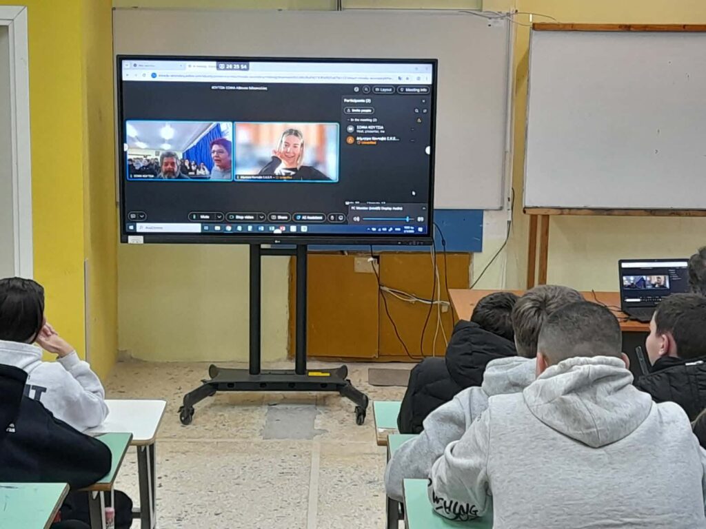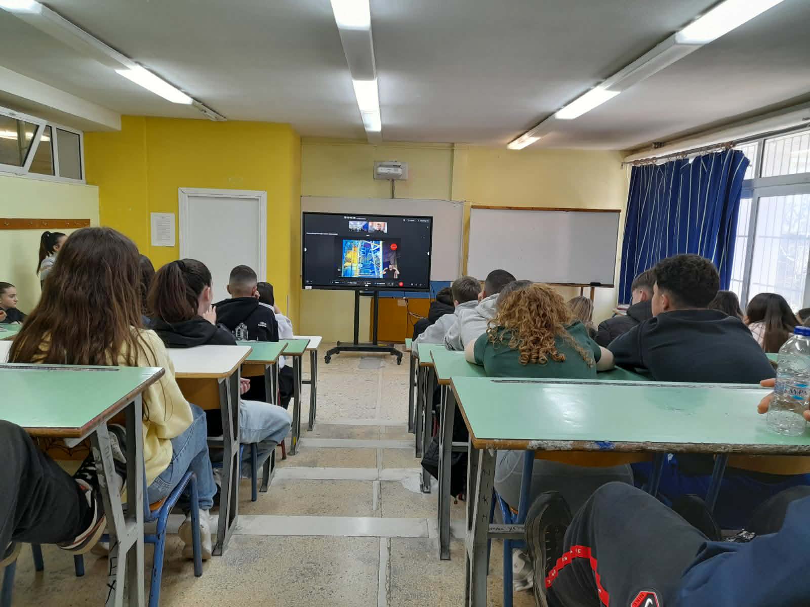 43 μαθητές και μαθήτριες της Γ΄Γυμνασίου συνομίλησαν με την κυρία Δήμητρα Κοντοβά που είναι Σύμβουλος εκπαιδευτικών προγραμμάτων συμπερίληψης και προσβασιμότητας του Σ.Κ.Ε.Π και άτομο με κινητική αναπηρία.